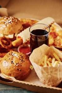 Unhealthy and junk food. Different types of fast food on the table, closeup